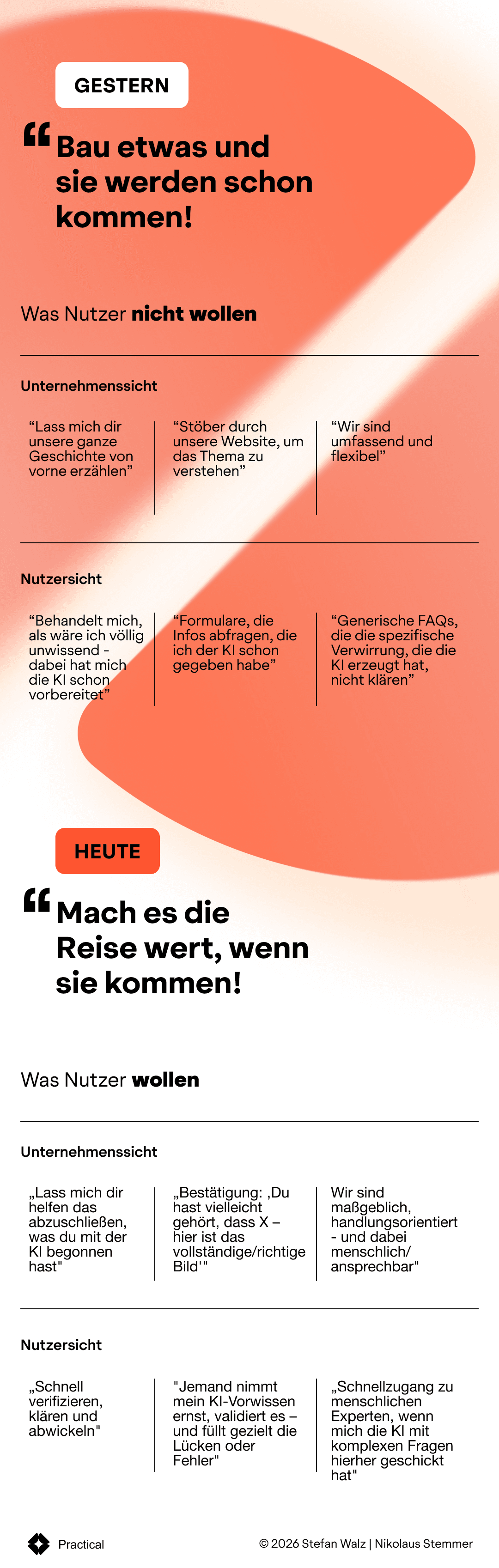 Content-Design ersetzt Navigation-Design. Eine Seite, die eine Frage vollständig beantwortet, gibt Orientierung – weil sie zeigt, wer ihr seid und was als nächstes sinnvoll ist. Struktur und Substanz übernehmen die Rolle des Menüs.