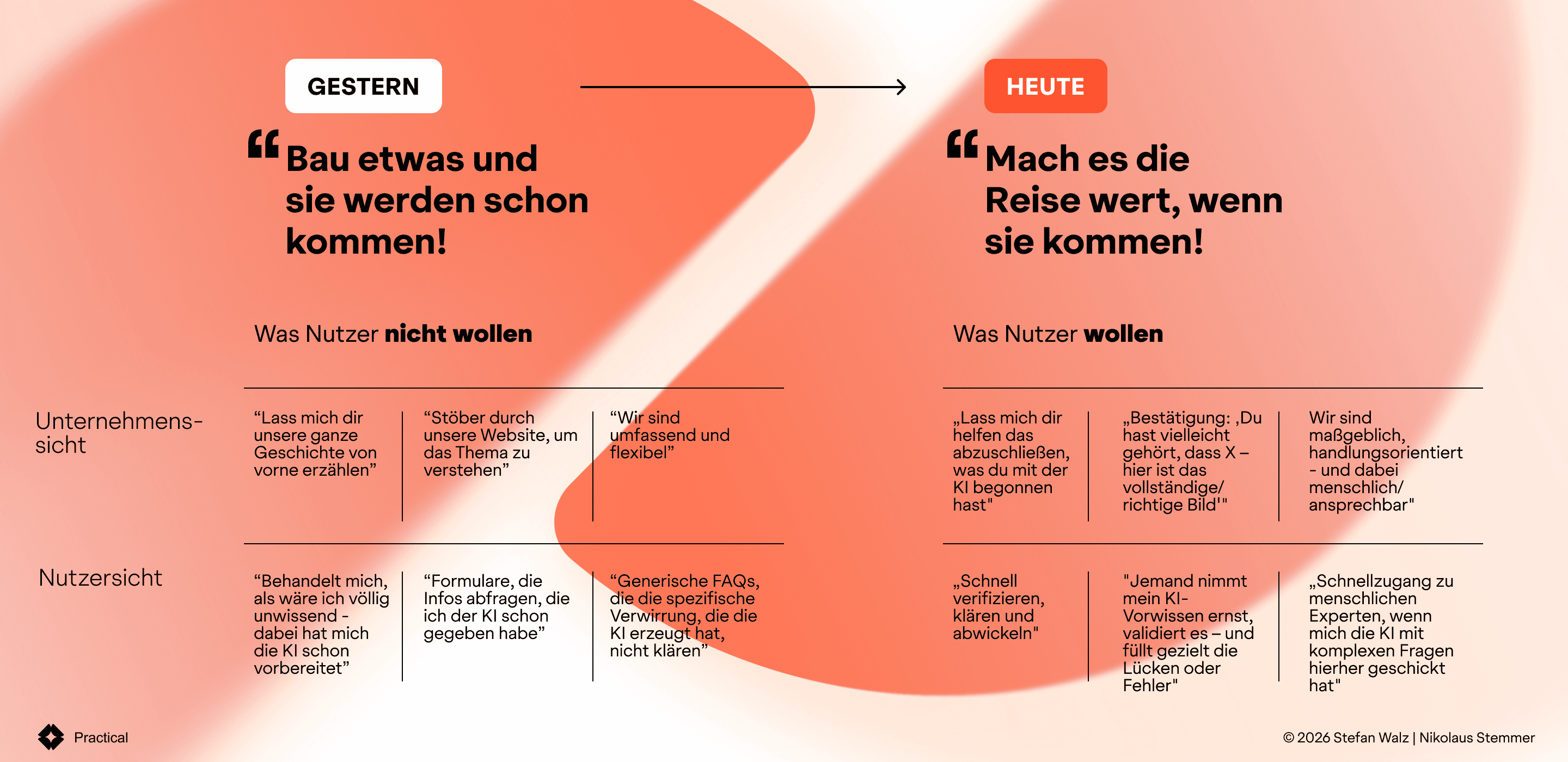 Der Umstieg ist kein Design-Problem. Es ist ein Denk-Problem: weg von „Wie führen wir jemanden durch unsere Website" – hin zu „Wie stellt sich unsere Website auf jeden möglichen Einstiegspunkt ein."